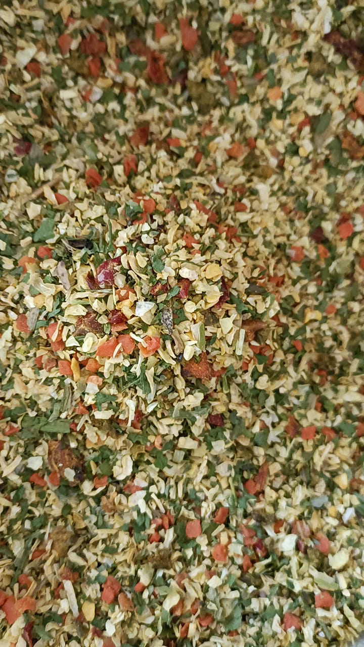 Ingredientes: Açafrão, alho granulado, cebola granulada, cebolinha, cenoura granulada, pimentão verde, pimentão vermelho e salsa desidratada