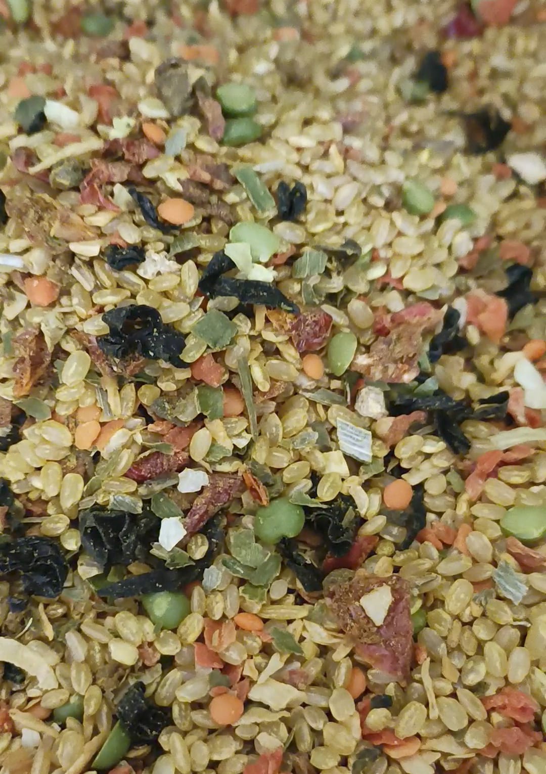 Ingredientes:açafrão , algas marinhas, alho poró, arroz cateto integral, cenoura desidratada, ervilha partida , lentilha siria, tomate deidratado.