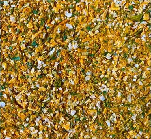 Açafrão (cúrcuma), salsa desidratada, alho desidratado e cebola desidratada.