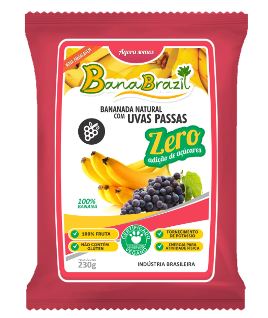 A Bananada Banabrazil é naturalmente leve, saudável e saborosa, feita da banana prata e sem adição de açúcares, ideal para quem deseja manter uma dieta com baixa ingestão de açúcares. Em sua composição estão carboidratos, fibras, proteínas e, principalmente, potássio, que tem um papel fundamental para os nossos músculos. Sua versão de Bananada com Uvas Passas zero açúcar, é uma opção prática, saudável e econômica. Embaladas individualmente, podem ser levadas com você, dividida com as pessoas e consumidas em qualquer lugar.