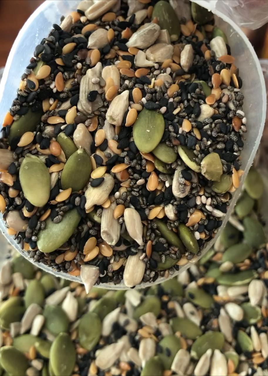Ingredientes: Semente girassol, semente de abobora, semente de linhaça dourada, chia, gergelim preto.