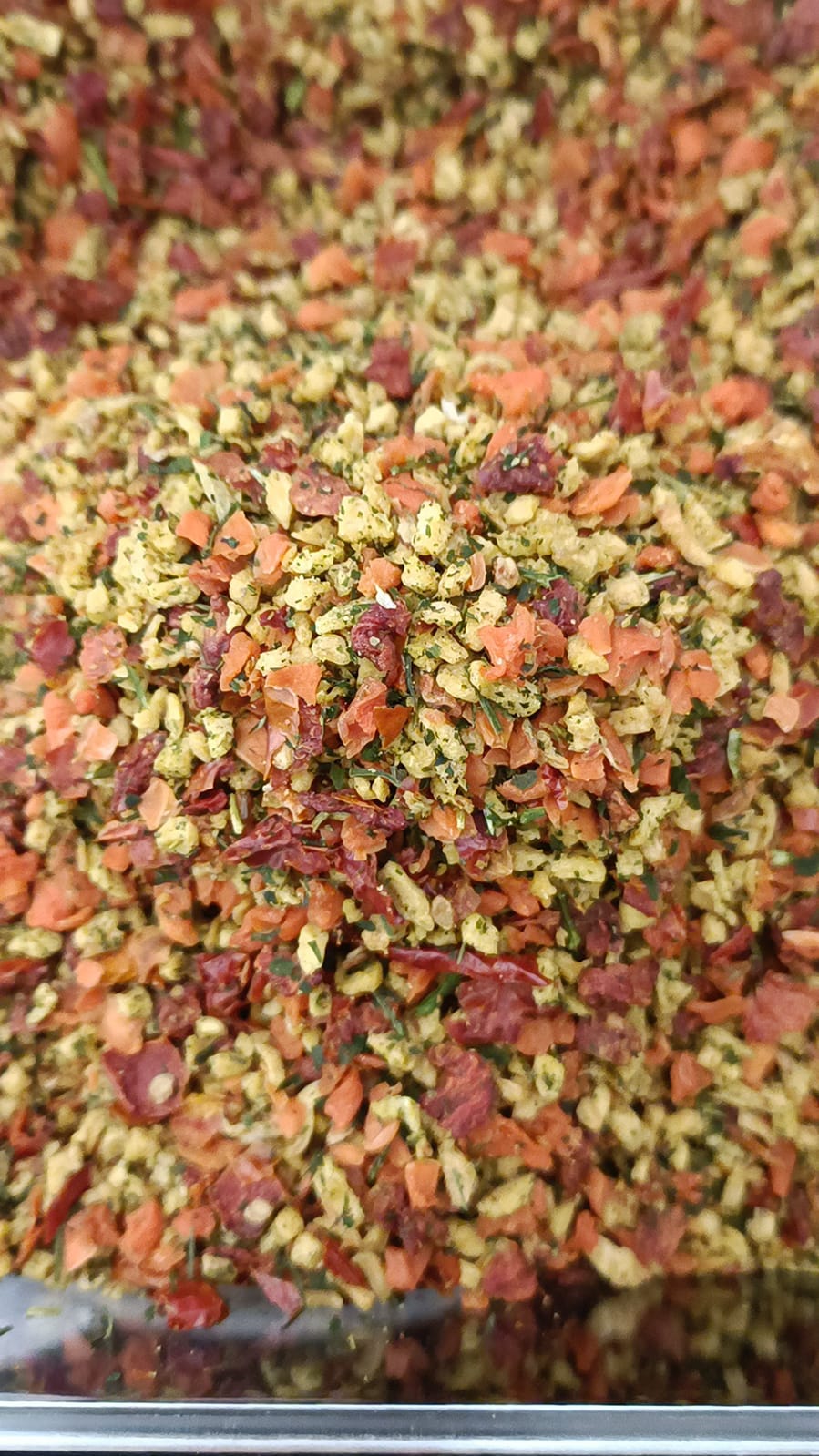 Ingredientes: alho frito, pimentão vermelho, tomate desidratado, salsa, cenoura.