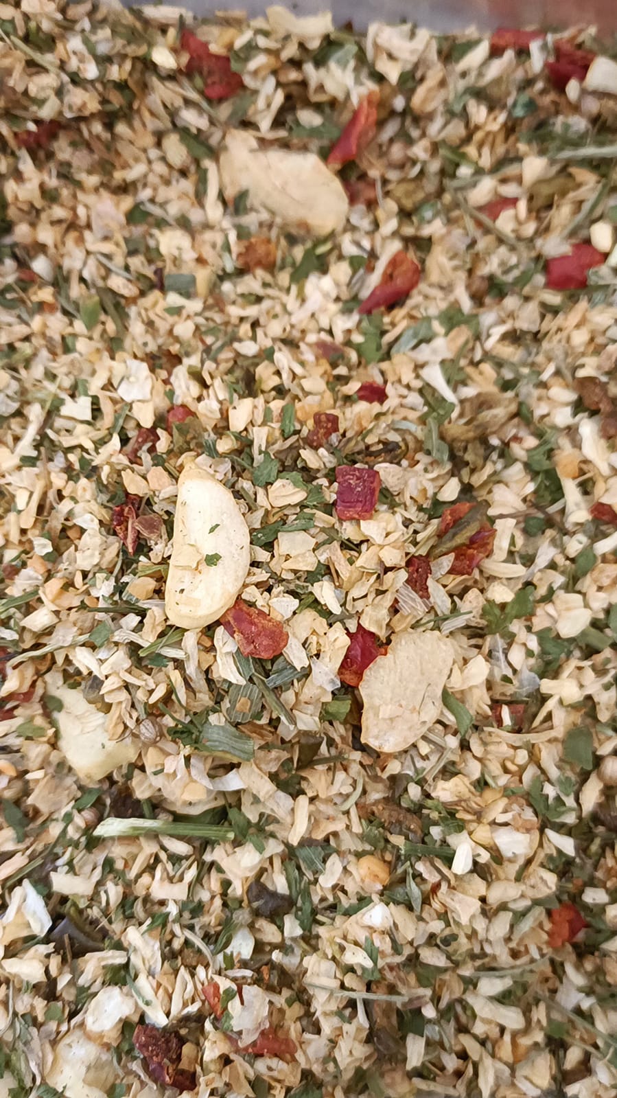 Ingredientes: Páprica doce, pimentão, cebola granulada, alho granulado, cúrcuma pura, salsa,alecrim triturado, tomilho, mostarda em grão, cebolinha verde, manjericão e grão de coentro.